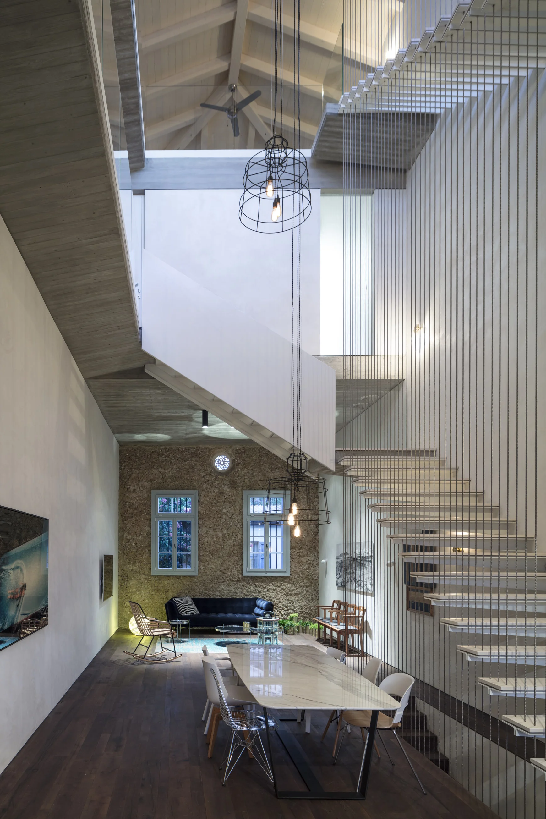 The bedrooms were placed in the front and the back ends of the house. The stairs located on one of the walls so create maximum space usage, and a tall, over 10 meters high open space spreads along the house. On its upper edge, a glass wall, opened to the sky and to the wide ocean view balcony. On the lower edge, the dining table. The entire home surrounds the open space. Light flows all around, reaching everywhere, awakens every point in space.